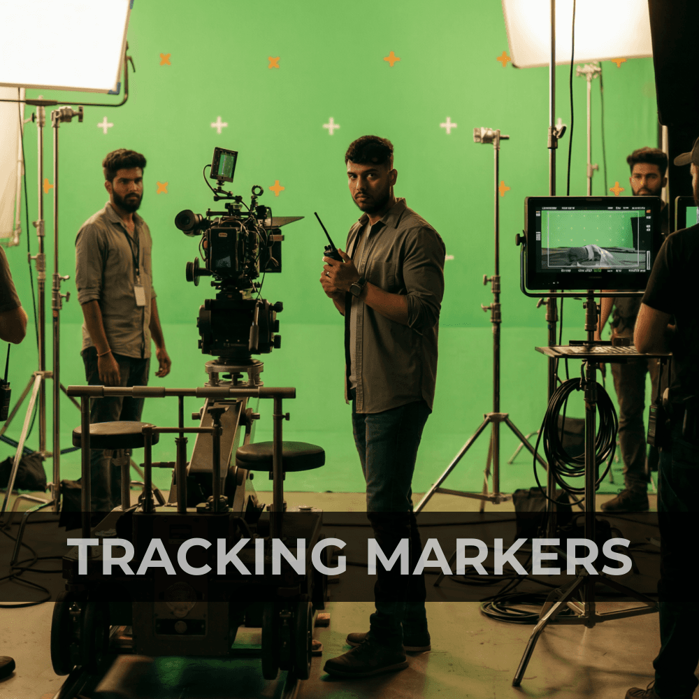 Tracking markers are placed on set to help software accurately follow camera and object movement.They ensure smooth 3D tracking and perfect alignment between real footage and CG elements.