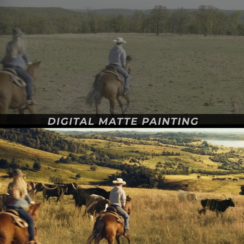 Set Extensions expand real locations with digital environments adding buildings, landscapes, or details that make scenes bigger, richer, and more cinematic without needing large physical sets.